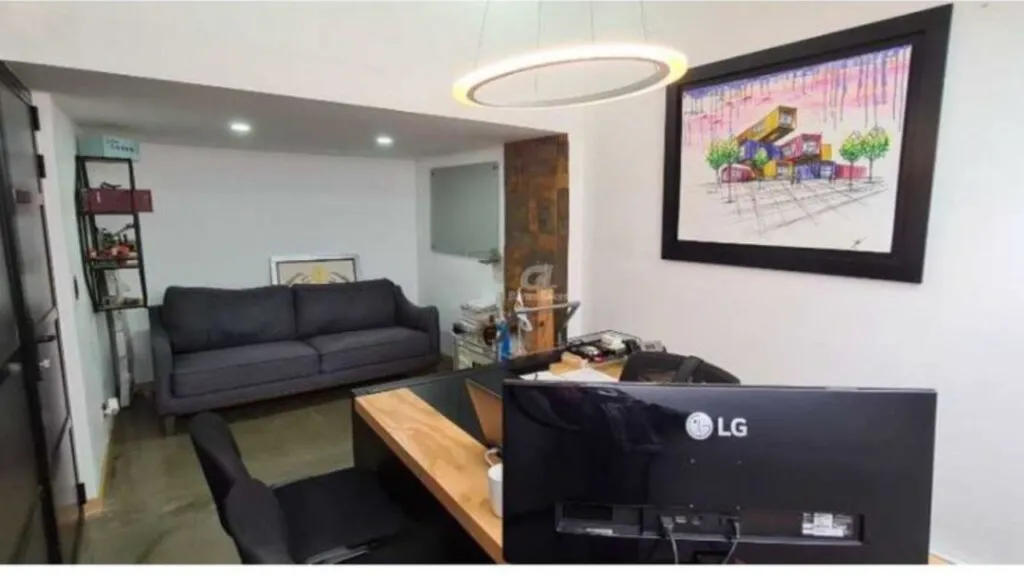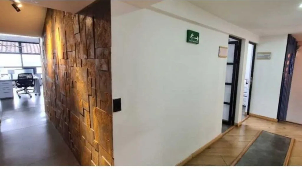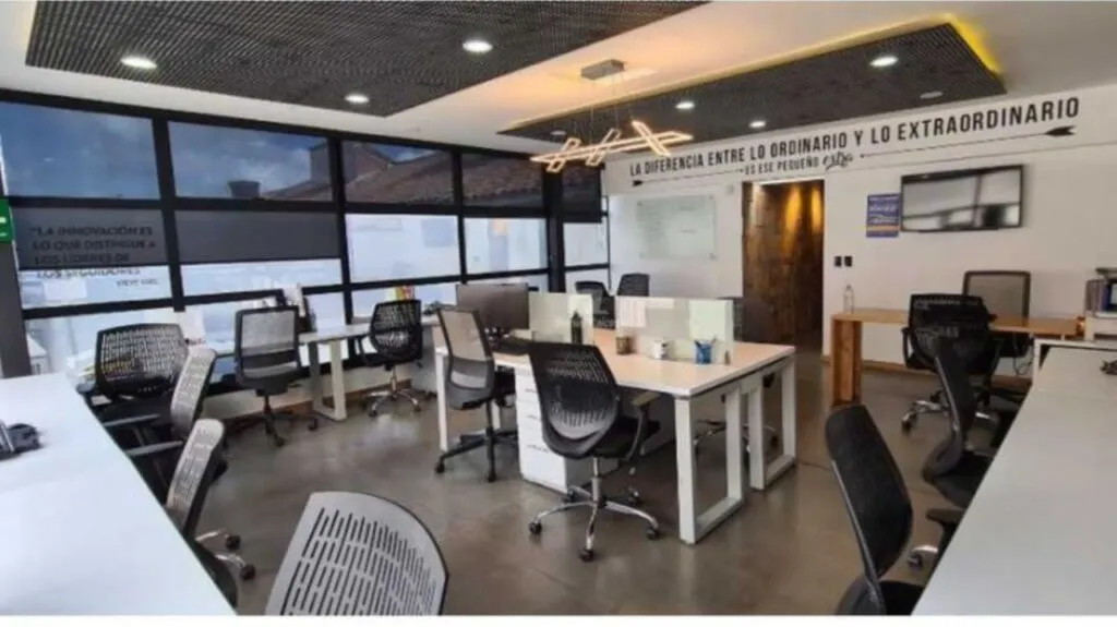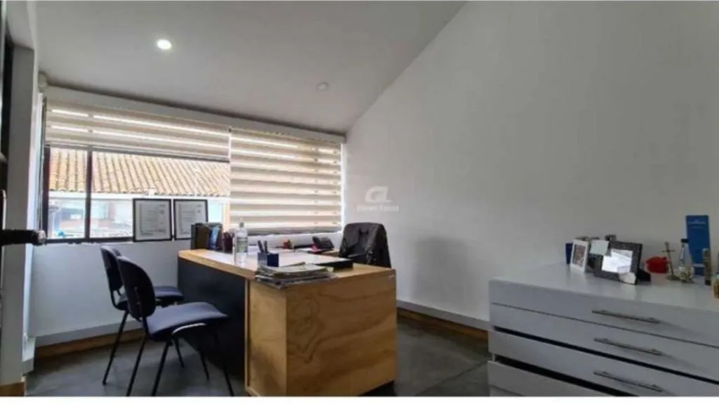 Consta de 2 niveles, 2 baños, baño mixto y baño privado, sala de juntas, 4 oficinas privadas, zona para 50 puestos de trabajo, cocineta dotada, cámaras de seguridad en las oficinas y parqueaderos, planta eléctrica, sistema de seguridad y vigilancia, 2 parqueaderos para carro y 10 para motos.